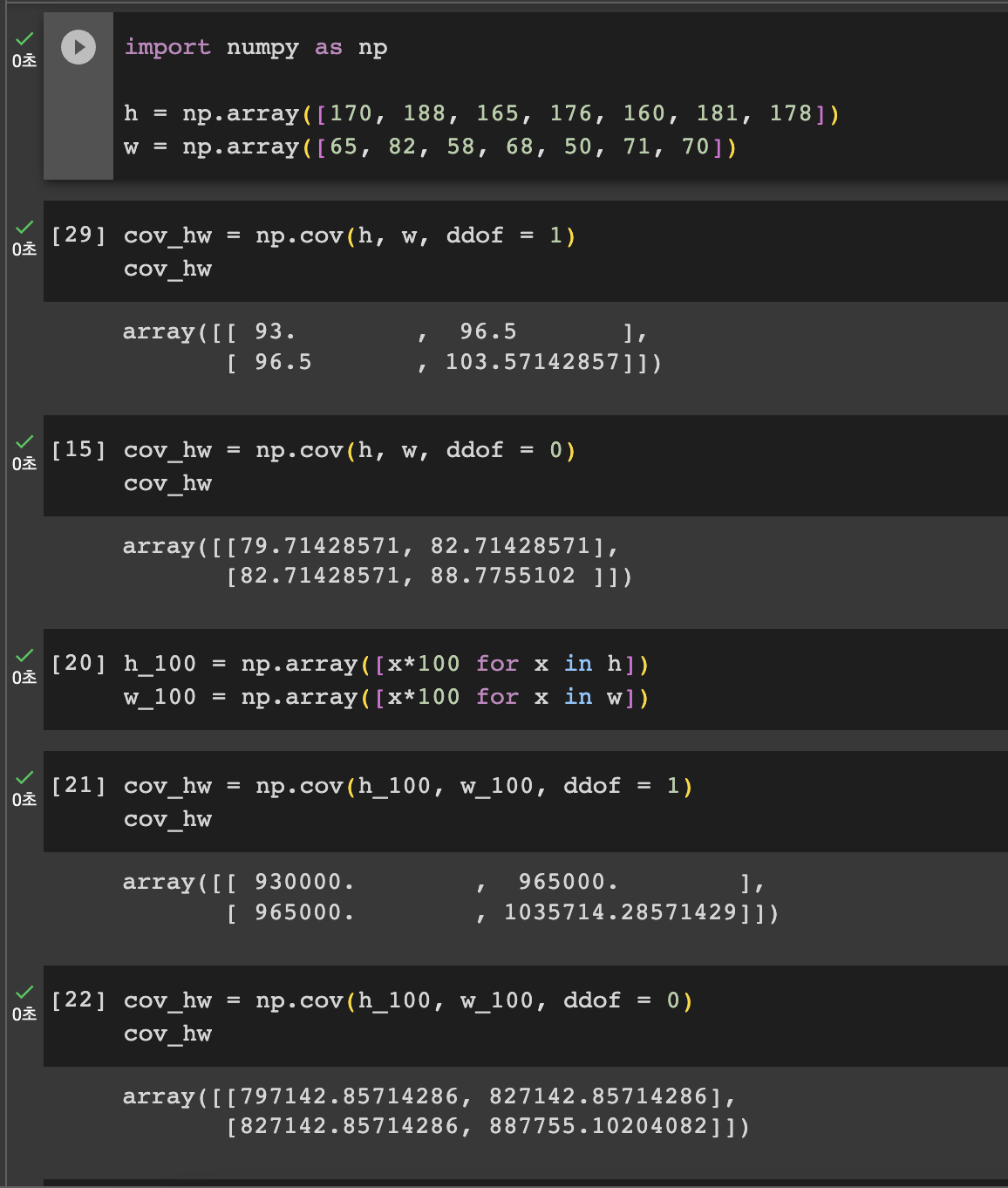 공분산 또한 마찬가지이다. ddof 는 자유도를 의미하며 현재 우리는 리스트를 생성하여 전체 리스트를 기준으로 진행하고 있기에 굳이 자유도를 지정해줄 필요는 없지만 여기서 다룰 중요한 이야기는 아니니 추후에 다시 이야기를 나누어 보자.