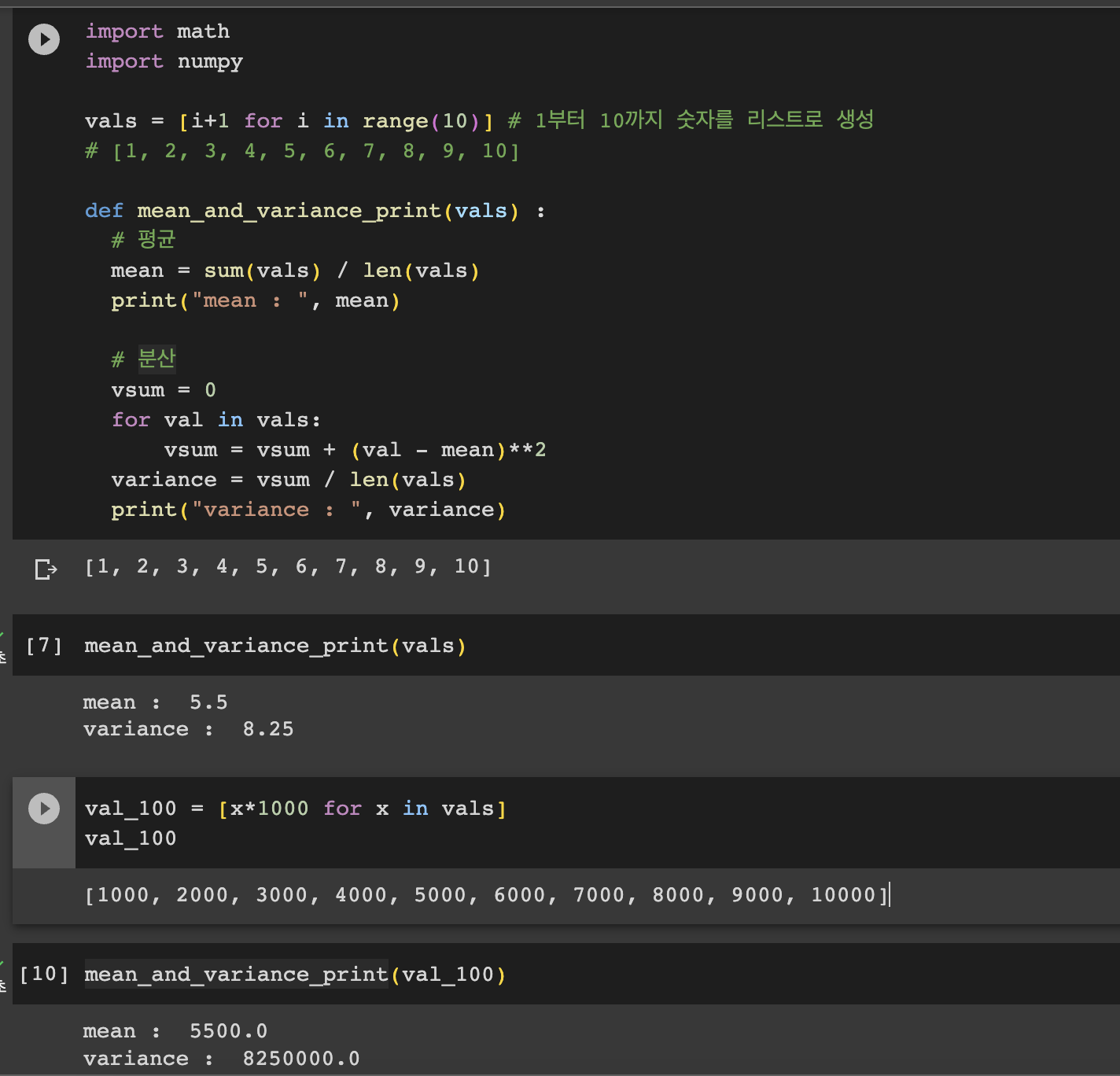 우리는 이전 게시물에서 분산은 평균과의 퍼진 정도라고 했었다. 위 코드를 보고 val_100에 해당하는 리스트는 진짜로 vals 보다 더 평균을 기준으로 멀리 있을까? 답은 아니다. 단지 각각 요소들의 값의 기준이 커져서 그런 것이다.