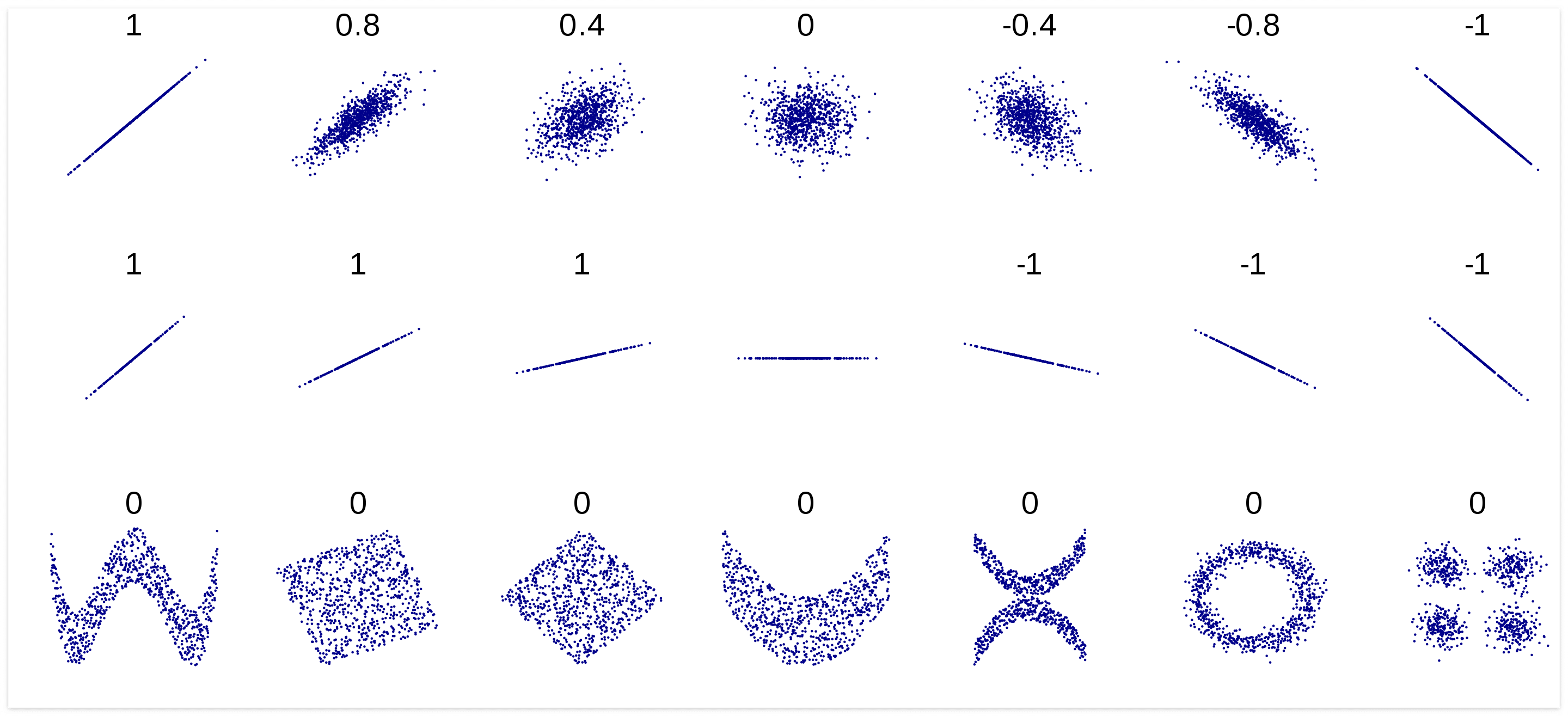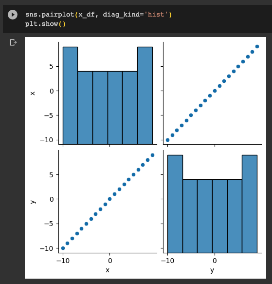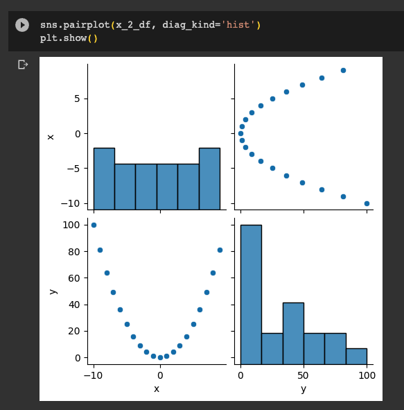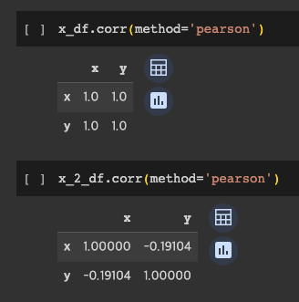 마지막 상관계수를 추출해보면 위와 같이 곡선인 y=x2 의 그래프는 당연하게도 상관계수가 0에 가까운 -0.1이 나온것을 확인할 수 있었다.