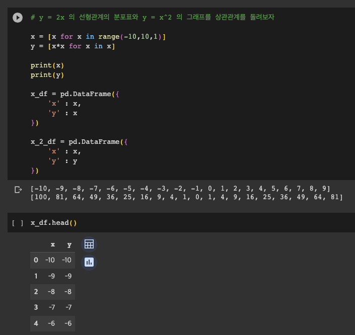 위 가정 중 먼저 y=x 그래프와 y=x^2 그래프의 데이터를 생성하여, 각각의 상관계수를 추출해보고자 한다.