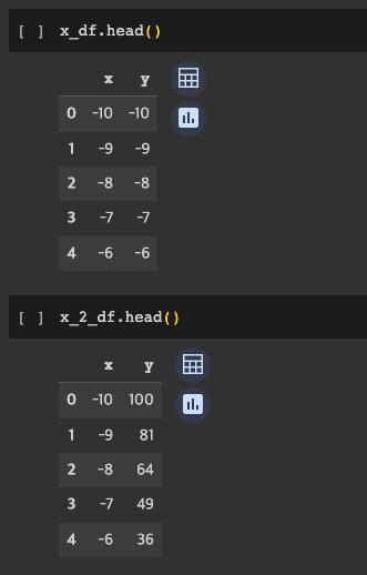 x_df 는 y=x 그래프에 맞춘 데이터 프레임이고, x_2_df 는 y=x^2에 맞춘 그래프이다.