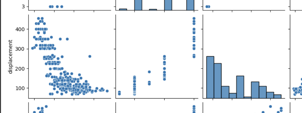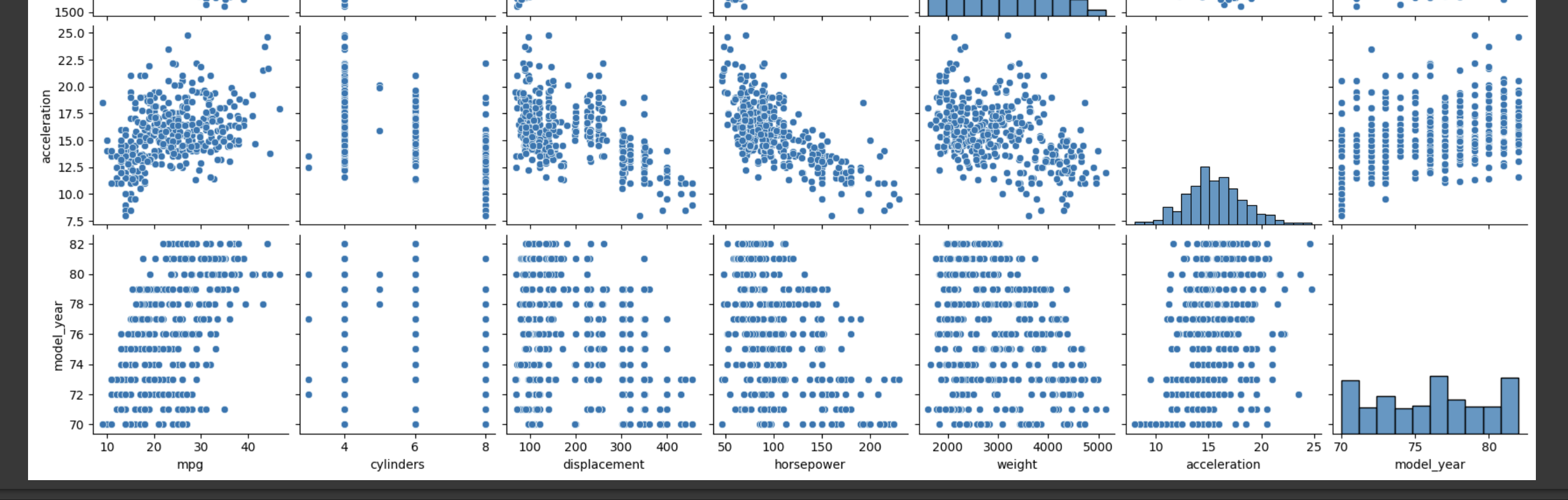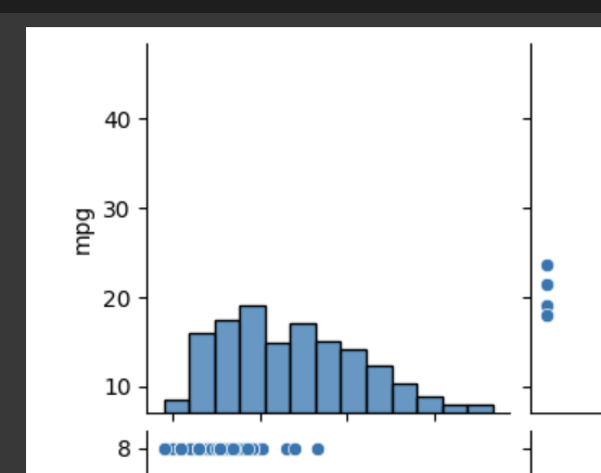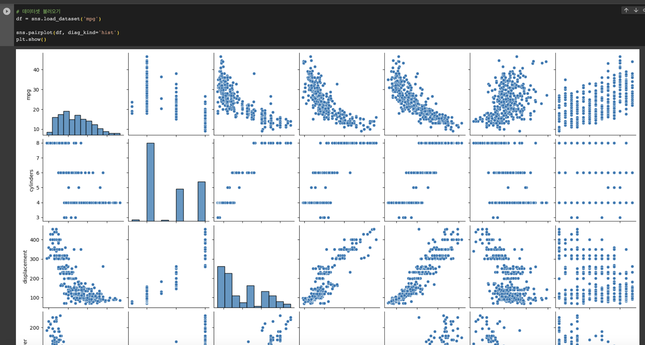 seaborn에 내재되어 있는 'mpg' 데이터를 matrix 산점도를 그려보고 히스토그램을 보고 최대한 정규분포에 가까운 컬럼과 정 반대의 컬럼을 각각 넣어서 출력 결과 그래프를 비교해서 보고자 한다.