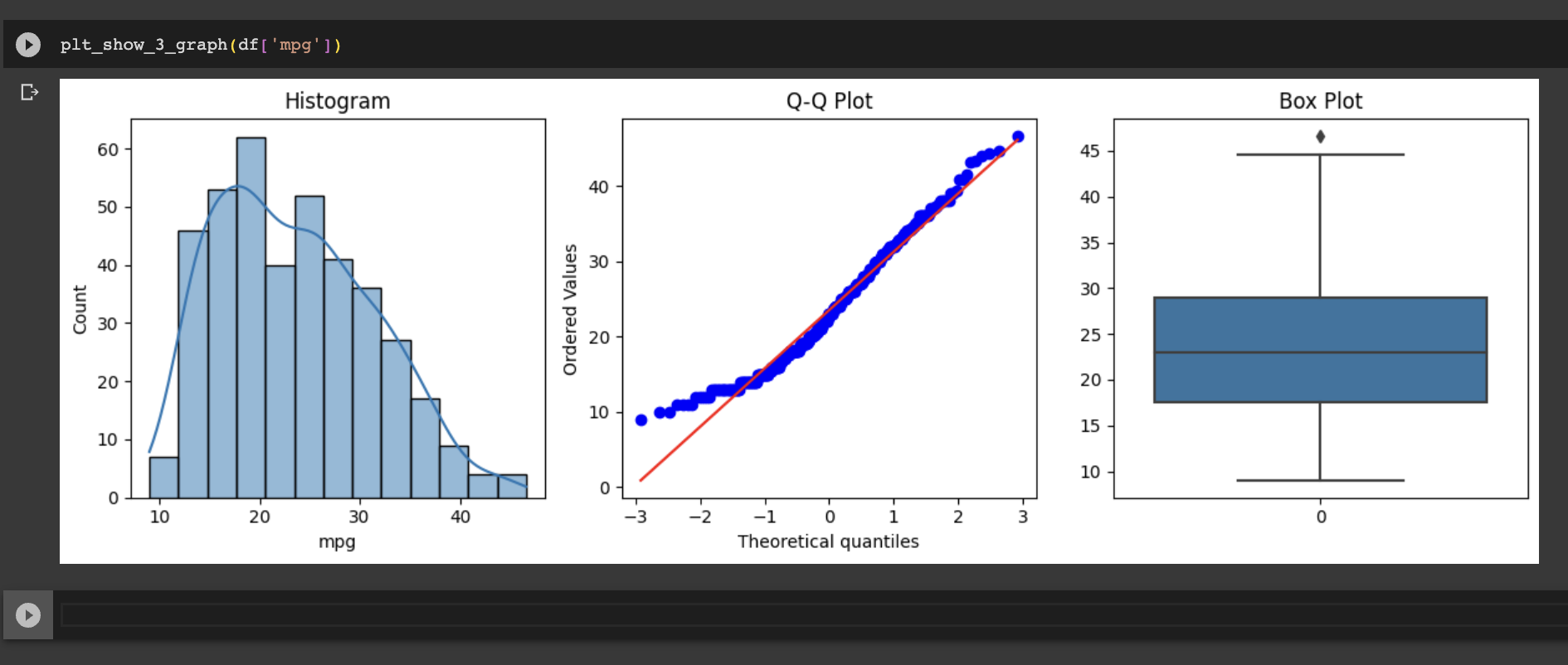 위 그림은 mpg 컬럼 데이터인데, 이렇게 정규분포 같긴 한데, 애매한 데이터가 존재한다. 각설하고 그림을 그려보자.