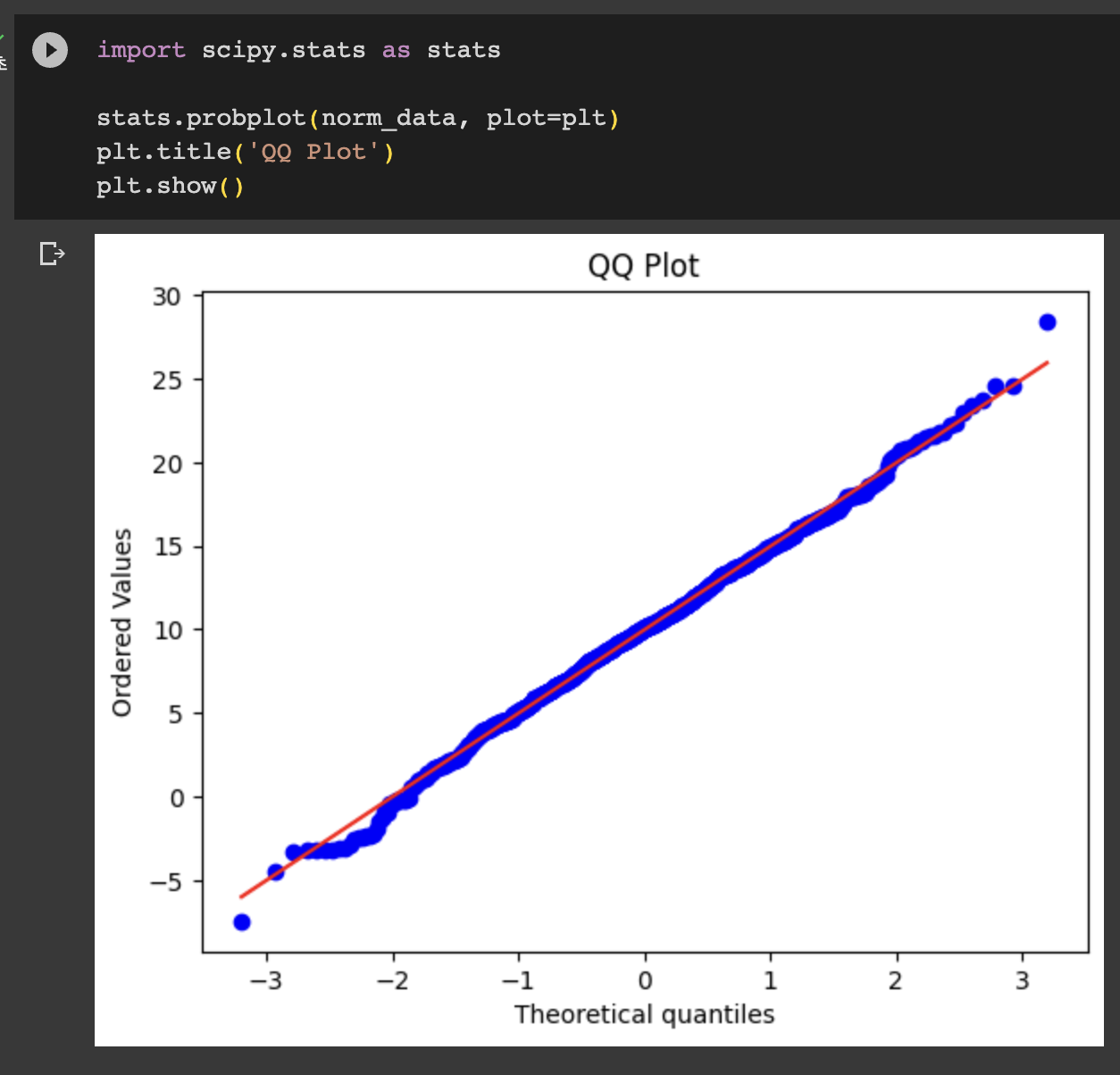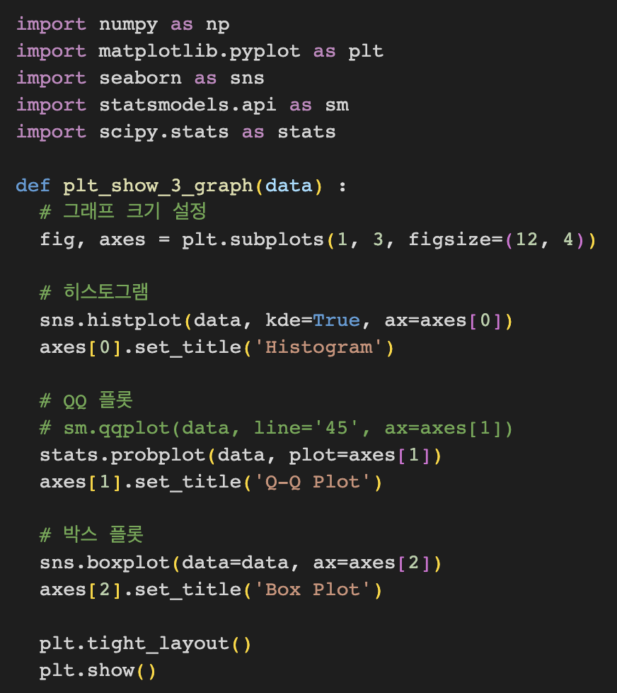 → Q-Q Plot은 풀 워딩을 보면 파악할 수 있듯이 분위수들을 비교하여 정규분포와 가까운지 보는 것을 말한다. 직선에 존재하는 빨간선과 분포도가 동일한 방향으로 일치하는 경우 정규분포라고 판단하는 시각화 방법 중 하나이다.