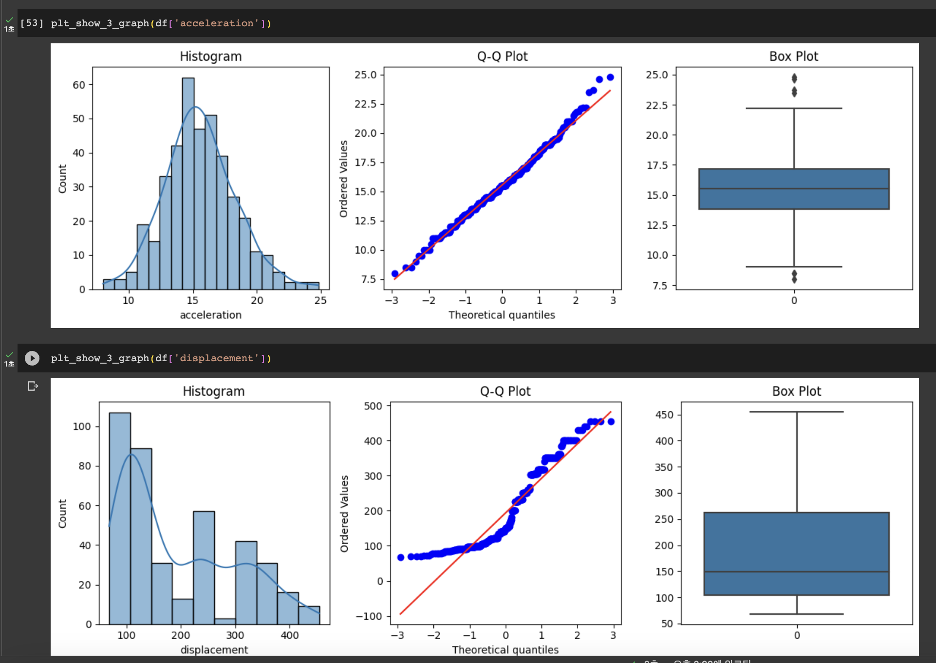 예상대로 위 'acceleration'은 기존 정규 분포 데이터를 생성했던 것과 비슷한 모습을 보이며, 'displacemet'는 정규 분포를 만족하지 못하는 모습을 보인다.