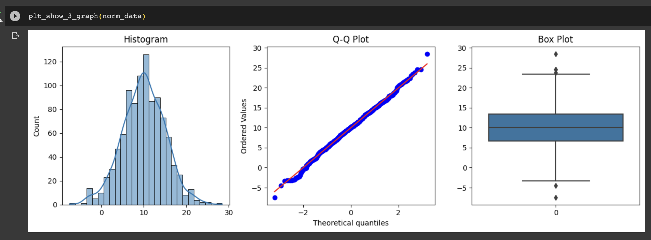 먼저, 위에서 선언한 정규분포를 따르는 데이터를 넣어서 기존 그래프들이 잘 추출되는지 확인해보자.