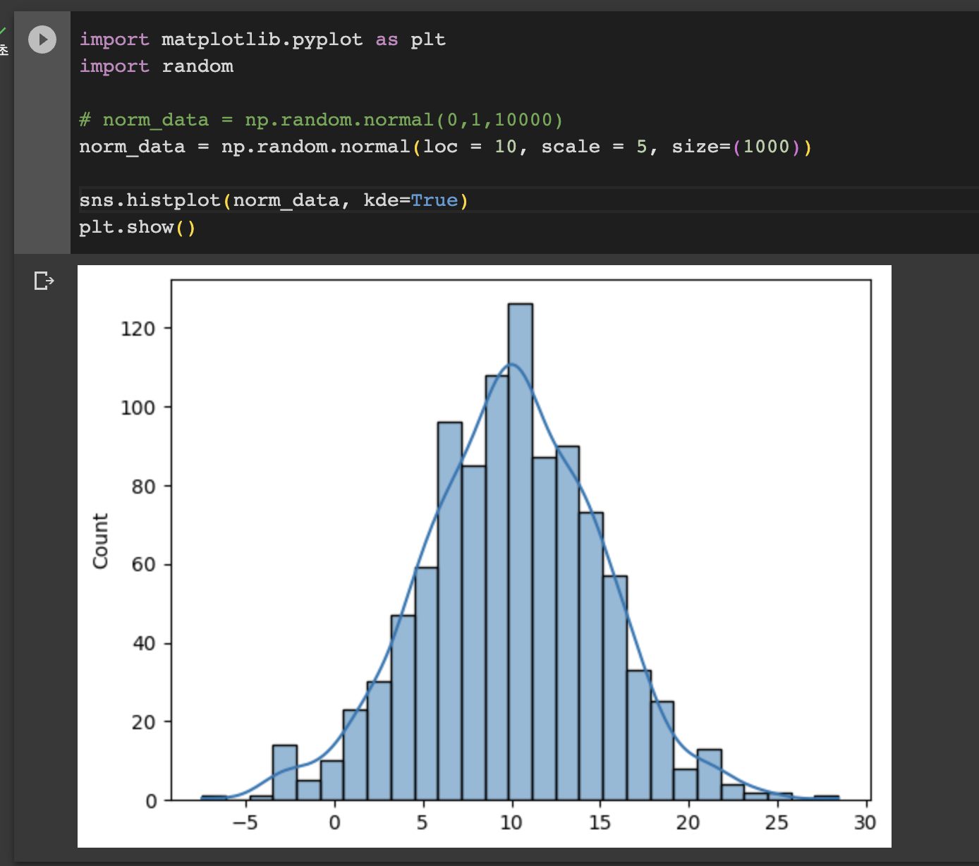 위 그림은 정규분포의 형태에 맞춰 데이터를 랜덤하게 뽑아서 직접 히스토그램을 그려본 것이다. 위 그래프 처럼 그래프가 종모양에 가까울 수록 정규분포 형태를 띄고 있다고 판단한다.