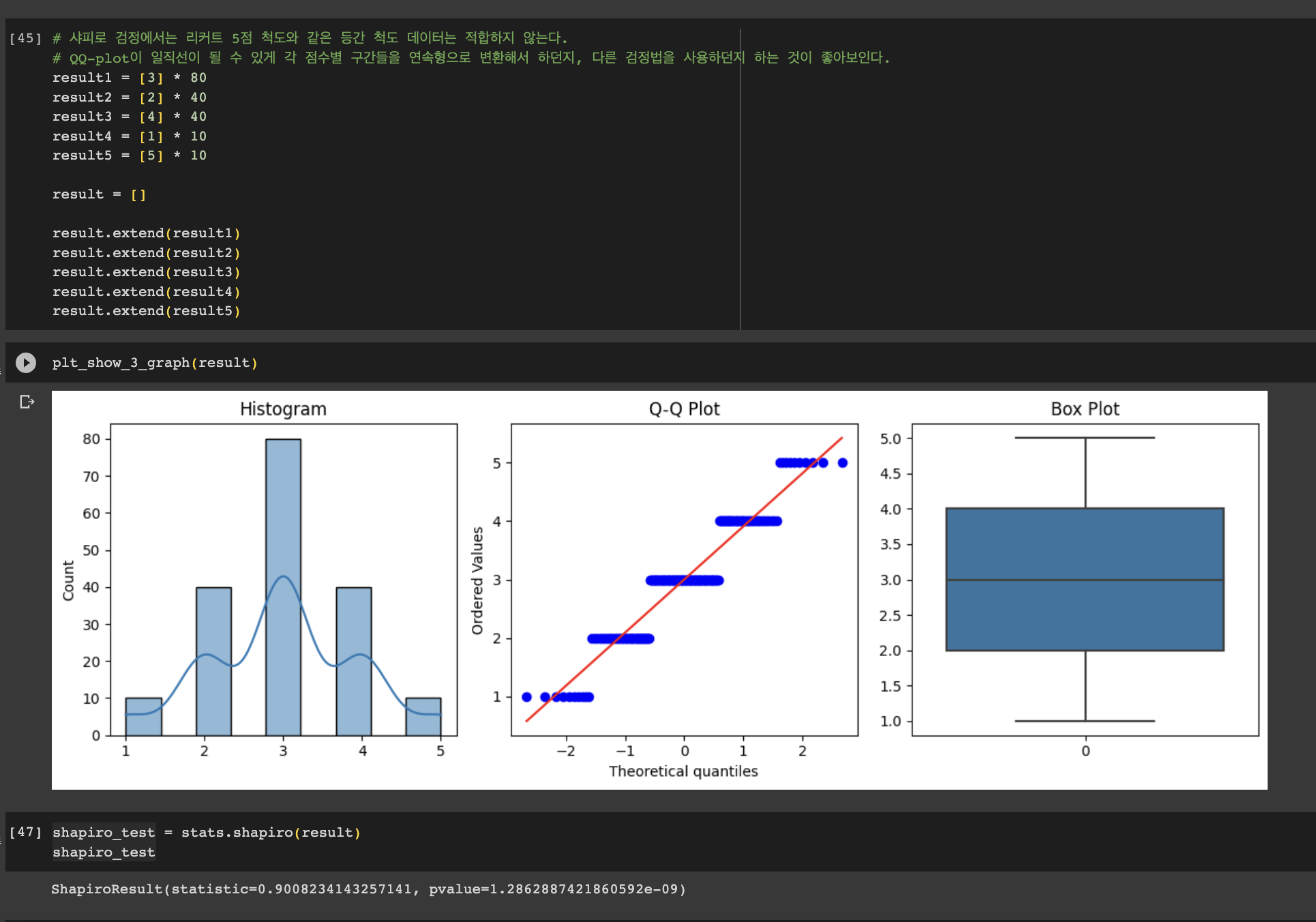 히스토그램을 보면 누가 봐도 정규분포에 유사하지만, Q-Q plot을 보면 계단 형태 처럼 보여진다.