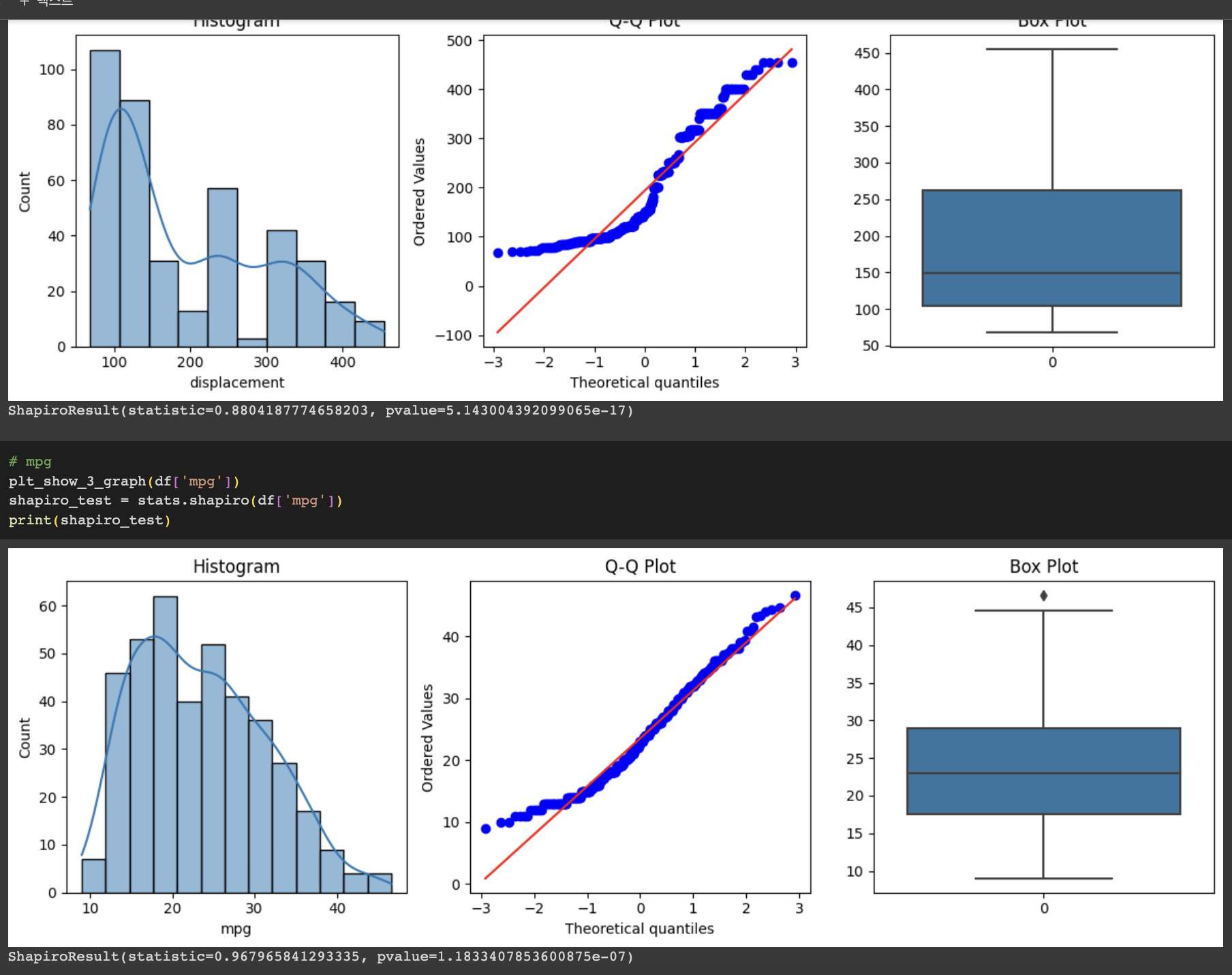 그러나, displacement 와 mpg 컬럼은 매우 작은 수로 유의수준 0.01 보다 작은 것을 확인할 수 있었고 이는 정규성을 충족하지 못한다고 보여진다.