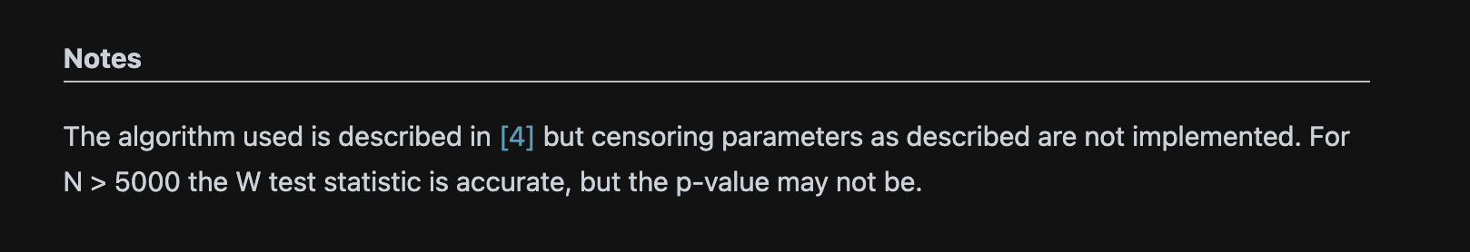 파이썬 코드 중 실제로 샤피로 검정 코드 documentation을 참고하면 아래 사진에서 보이다 싶이 5,000개 이하로 돌리기를 권장한다.