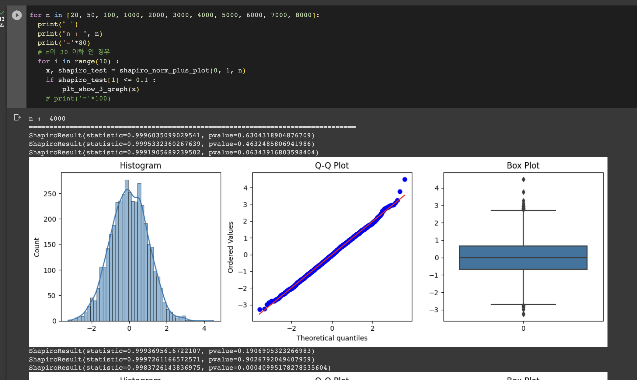 4천개 기준으로는 그림으로도 완벽한 정규분포에 가깝지만 p-value가 0.1 이하인 것들을 확인할 수 있었다.