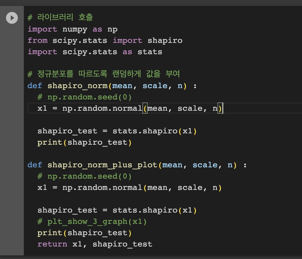 위 코드 처럼 평균과 스케일 그리고 표본 개수에 대해 정의를 내린 뒤 정규 분포에 만족하도록 설정 한 뒤 추출하여 샤피로 테스트를 진행해보고자 한다.