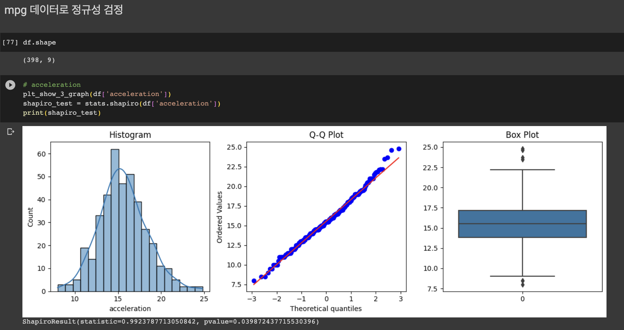이제는 실제 데이터(정확히는 seaborn의 내재 데이터인 'mpg')를 활용해서 직접 정규성 검정을 진행해보자.