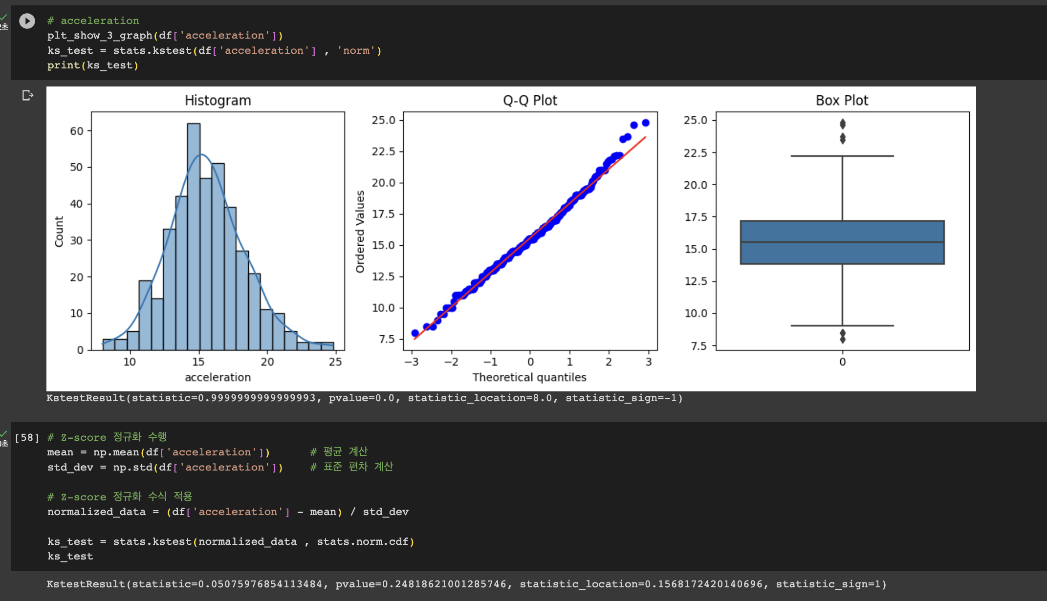 이것을 위 코드처럼 정규화헤서 진행하면 0.24의 값을 보여주며 정규성을 만족하는 것을 볼 수 있다.