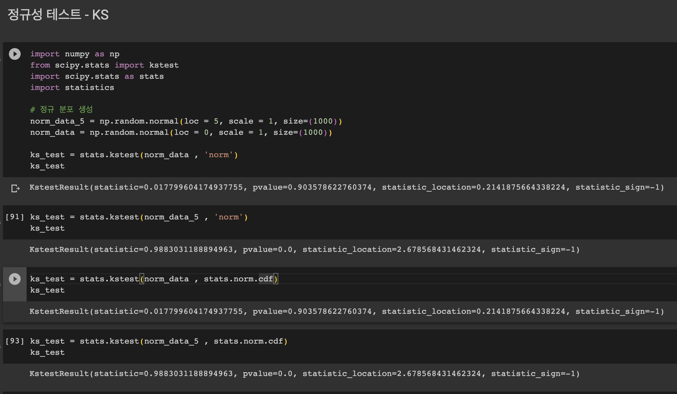 kstest 에 cdf 옵션에 'norm' 으로 설정하면 정규분포가 아닌 표준 정규 분포와의 누적 분포를 비교하기에, 오류가 발생할 수 있으니 이점을 유의하자!!