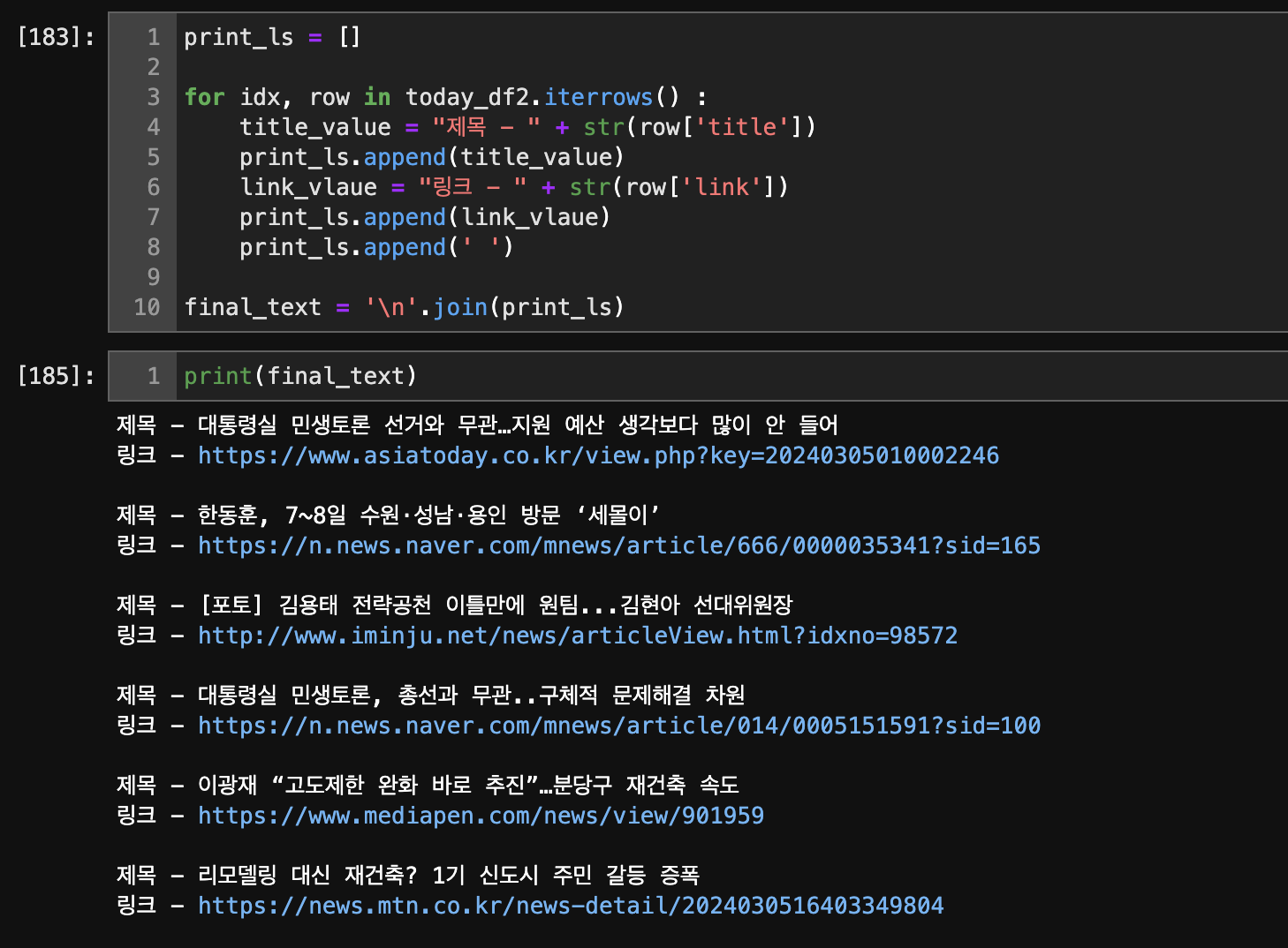 이후 해당 today_df2라는 DataFrame을 기준으로 제목과 링크를 각각 하나의 텍스트로 취합해서 프린트를 해보았다.