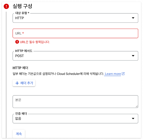 그 다음 부분은 실행 구성이다. 위 실행할 URL은 Cloud Functions 의 URL을 넣으면 된다. 그리고 실행 구성인 HTTP 구조는 기존에 Cloud Functions를 생성하면서 테스트 했던 json 구조와 동일하게 가져가면 된다.