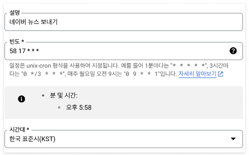 시간대는 우리나라 시간으로 지정하고 빈도 부분은 크론탭으로 작성하였다.
