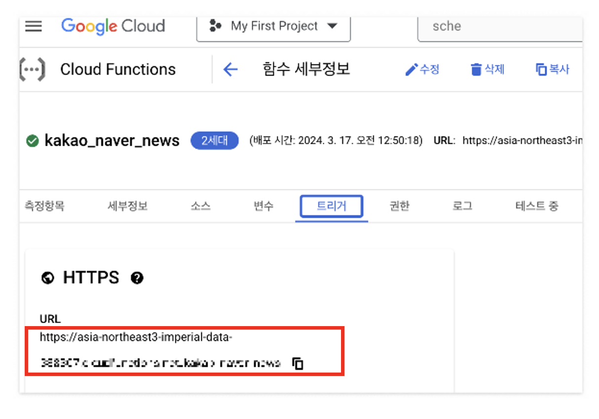 URL은 Google Cloud Functions 에 트리거로 들어가서 존재하는 URL을 복사해서 입력하면 된다.