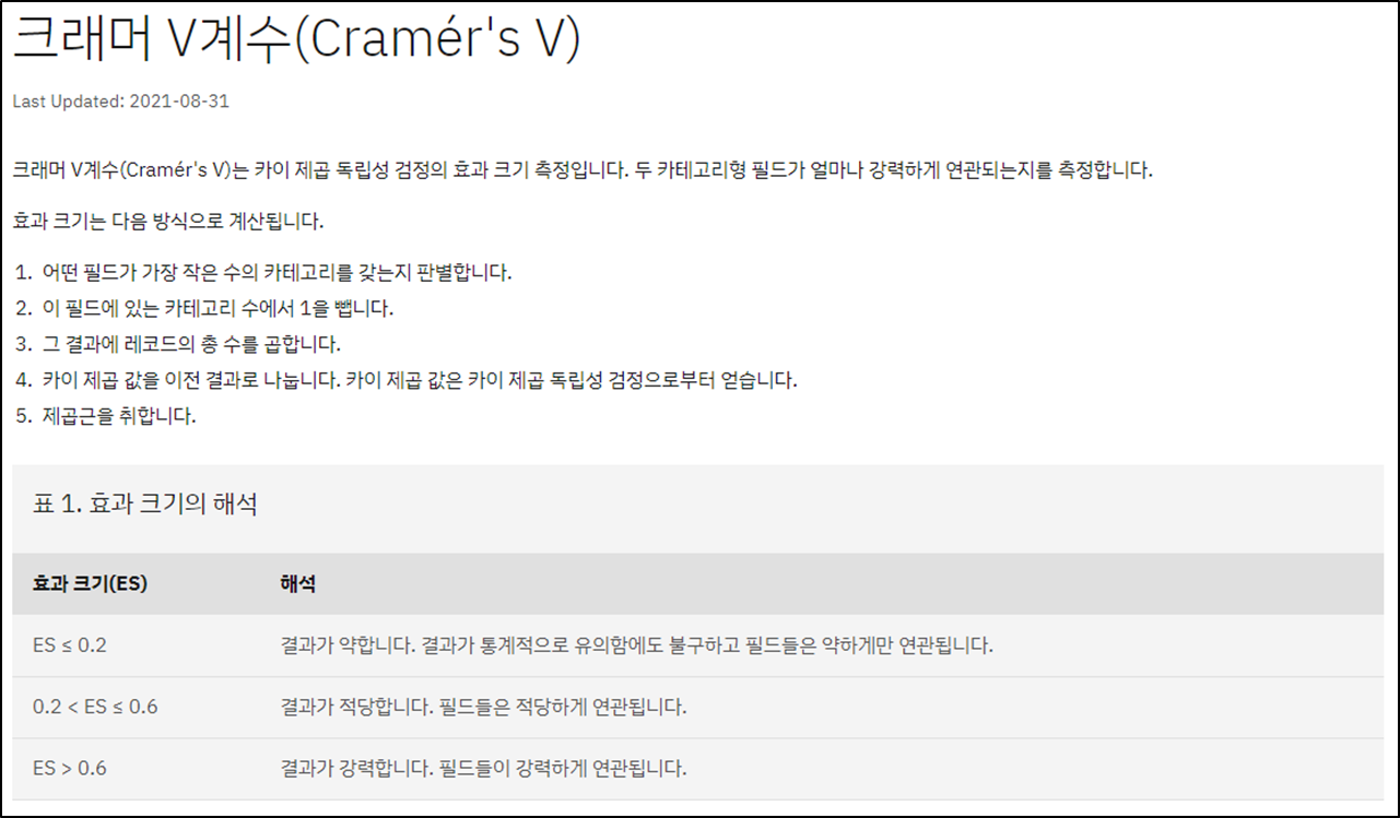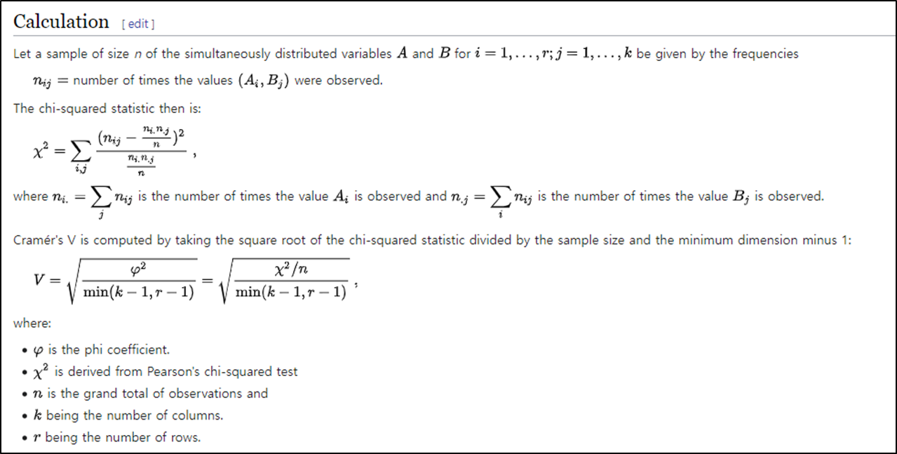 ( 참고 링크 : 크래머 V계수(Cramér's V) - IBM Documentation / Cramér's V - Wikipedia )