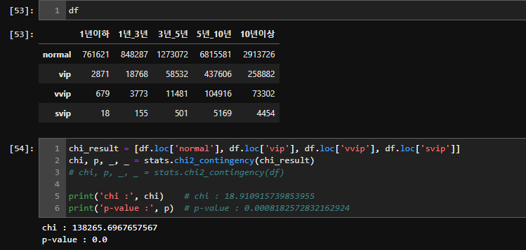 가입 기간과 고객 등급 간 독립성 검정 진행(카이제곱 독립성 검정)