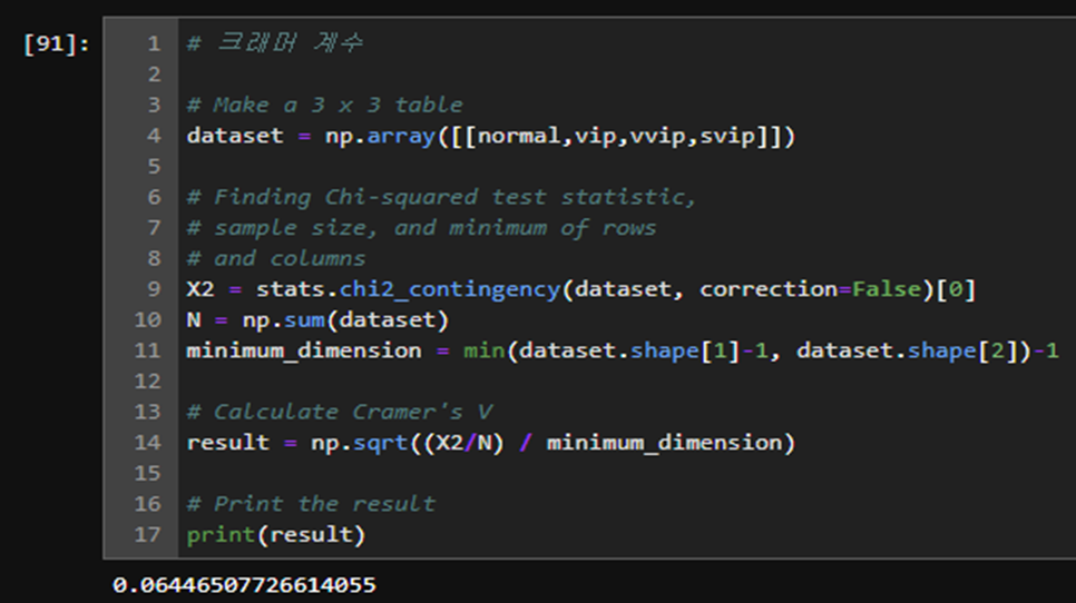 크래머 V 계수는 2개의 변수의 독립성 검정을 진행한 후 연관되어 있다는 통계적 결론이 도출되었을 때, 해당 연관성의 정도를 보여주는 척도