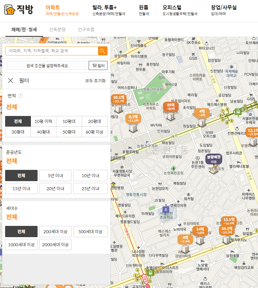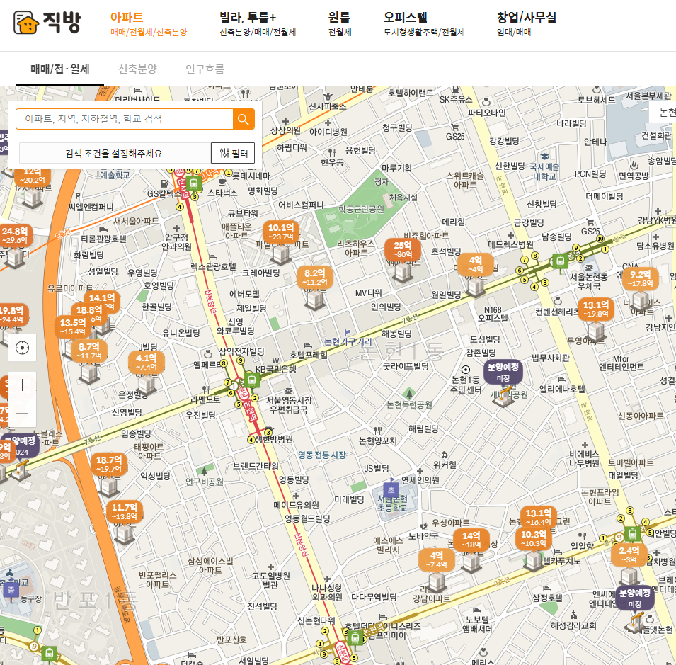 매매/전,월세를 클릭하면 해당 아파트, 지역, 지하철역, 학교 등 검색을 통해 해당 아파트 매물들을 볼 수 있다.