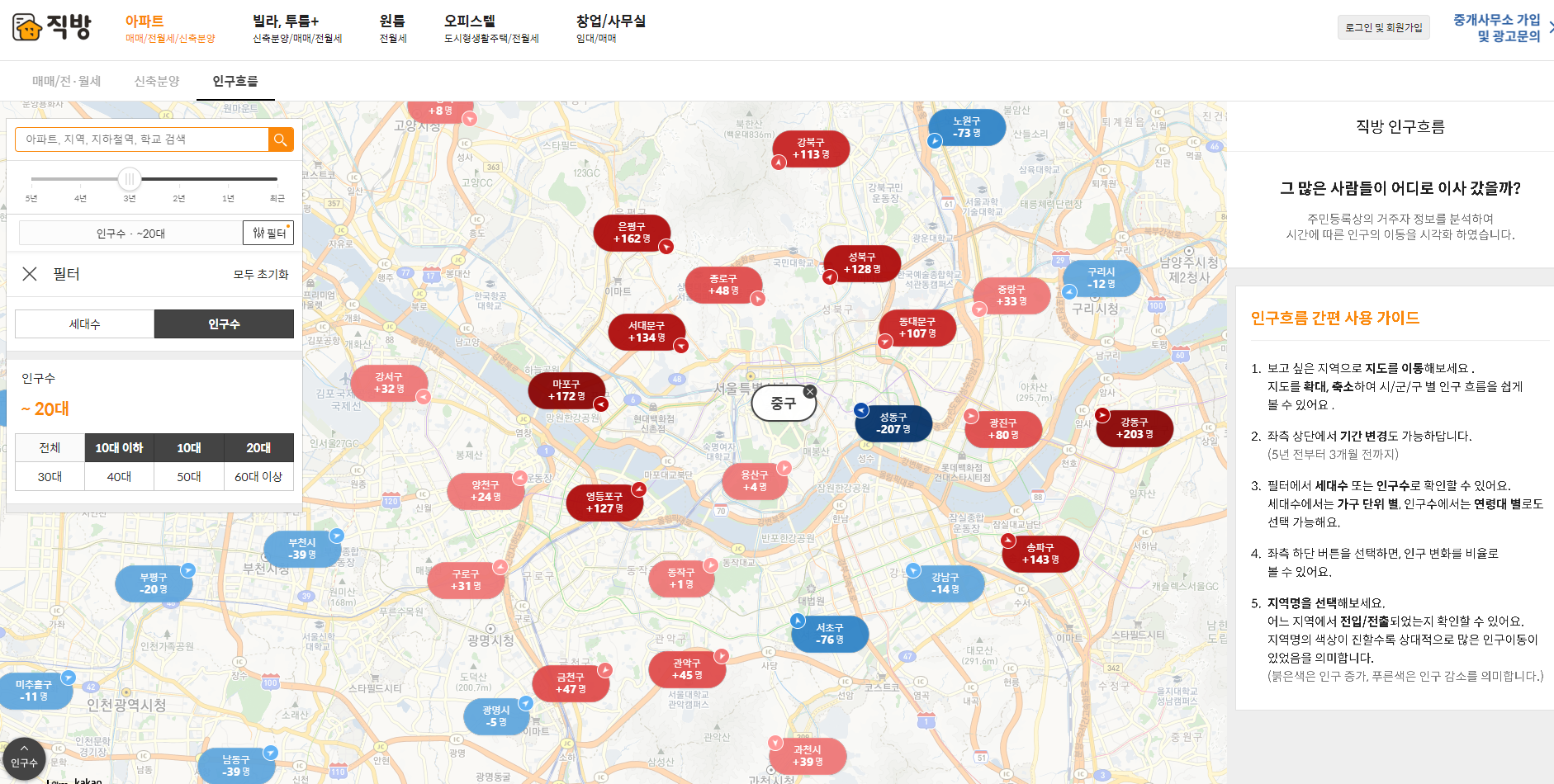 타 플랫폼을 아직 보진 못 했지만, 머릿 속으로 생각했을 때 '인구 흐름' 이라는 기능은 예상 밖의 기능이었다.